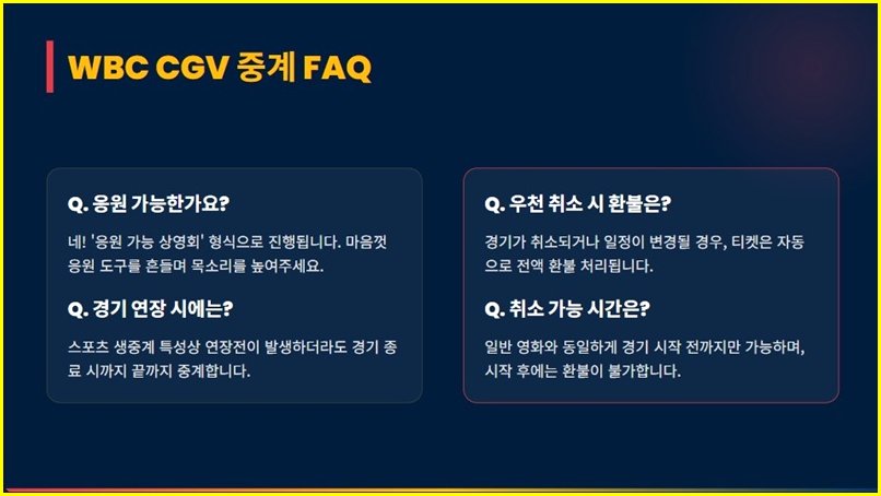 Q. 한일전 같은 인기 경기는 2026 WBC 일정 및 중계 정보 외에 영화관 예매도 되나요?